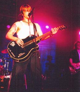 I had made a banner that read "Johnny, everything you are falls from the sky like a star". It had moons and stars painted all over it and it looked so cool. Johnny loved it and during Dizzy, he saw it and said to me "Thanks I forgot the words!" It was really adorable! He smiled at me alot during the show and laughed at me for freaking out so much during Just The Way You Are! I think he was happy too to see someone who knew all their songs. After all the old Goo is just as great as the new Goo! The crowd was pretty calm, no fights or anything stupid like that! Johnny wore his white "wifebeater" (who made up that term anyhow??), black Adias pants again and sneaks. Robby had on a really cool black shirt and jeans.. Mike had on a silver shirt and shorts.