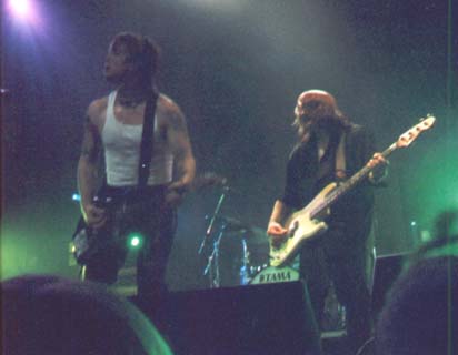 OK, on to Goo...oh but before they came on, there was of course equipment change and stuff. I was kinda bored, so I kept reading all those funky stickers the Goos had on their equipment. I thought they were really funny and they sure kept me entertained while we waited...actually I got so bored, I wrote them down to share with you guys! So here all the ones I saw - on their speakers and amplifiers, they had, "Poverty Sucks", "Mean People Suck", "Cheap People Suck", "Girls Kick Ass", and "Dont Be A Dick". Haha! On Dave's keyboards, he had "Ladies - Not from the earth" and "Only cool chicks can do me", (lol!) and on Johnny's guitar, I saw "Lawyers Suck" and something else with the word "dick". Hmmmm.....interesting, eh? Also, every once in a while, we got to see glimpses of Johnny and Robby from behind the curtains in the balcony peeping out at the audience! People were like, "Hey there's Johnny!" and "Oh my god, it's the band!!!". You could tell everybody was damn anxious to see the Goos! Heck, I was all ready to scream and jump up and down like a mad woman! :-)